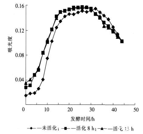 从上面比较中看出,未活化菌种接种和经活化的菌体接种培养,目标产物达到最大值的时间前者比后者提前4 h,这主要是由于经活化8 h的菌种使生长的迟缓期缩短或消失所造成的。