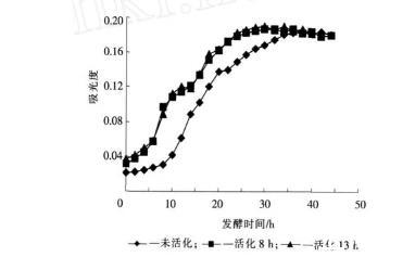 溶氧曲线从侧面也能反应出菌体的生长过程,菌体生长越快,所需氧气量越大,发酵液中的溶氧量就越低。图4中用未经活化菌种发酵时,溶氧最低点出现在菌体生长15~20 h的对数期,说明此时菌体增长率最高、新陈代谢最活跃?;罨? h和活化13 h的菌种发酵时,溶氧量最低点都出现在12 h,说明其最快增长期比用未活化的菌种发酵提前3 h。针对出现溶氧最低点的时刻,生产中可以在溶氧最低点时刻提高供氧量和补料,从而延长菌体的对数生长期或出现第2对数期,达到高效发酵的目的。