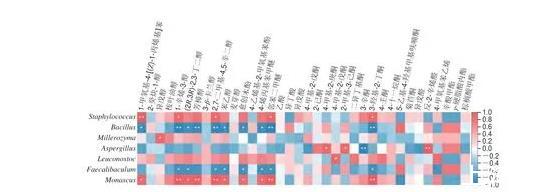 为了进一步了解黄豆酱发酵过程中微生物与挥发性风味物质之间的关系,通过对优势微生物和挥发性风味物质数据进行同理化处理和相关性分析,结果如图2所示。