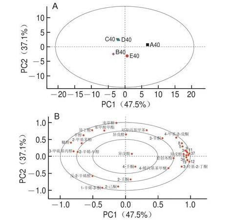 为了进一步了解红曲霉强化发酵对黄豆酱挥发性风味物质的影响,对39种主要呈香风味化合物进行PCA,如图1A所示。PC1和PC2累计贡献率达到84.6%,可代表大部分风味物质的信息。