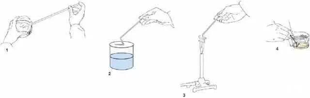 (1)接种灭菌(2)开启棉塞(3)管口灭菌(4)挑起菌苔(5)接种(6)塞好棉塞。
