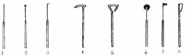 1.接种针2.接种环3.接种钩4.5.玻璃涂棒6.接种圈7.接种锄8.小解剖刀
