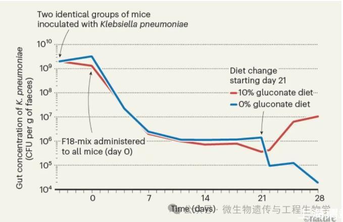 Furuichi等评估了小鼠粪便中的碳水化合物水平,在缺乏肠道微生物的小鼠中葡萄糖酸盐浓度很高,但在含有F18-mix的小鼠中葡萄糖酸盐浓度显著降低,说明F18-mix具有降低葡萄糖酸盐浓度的作用。除此之外,在食物中添加葡萄糖酸盐可以逆转F18-mix带来的定植抗性(图1)。