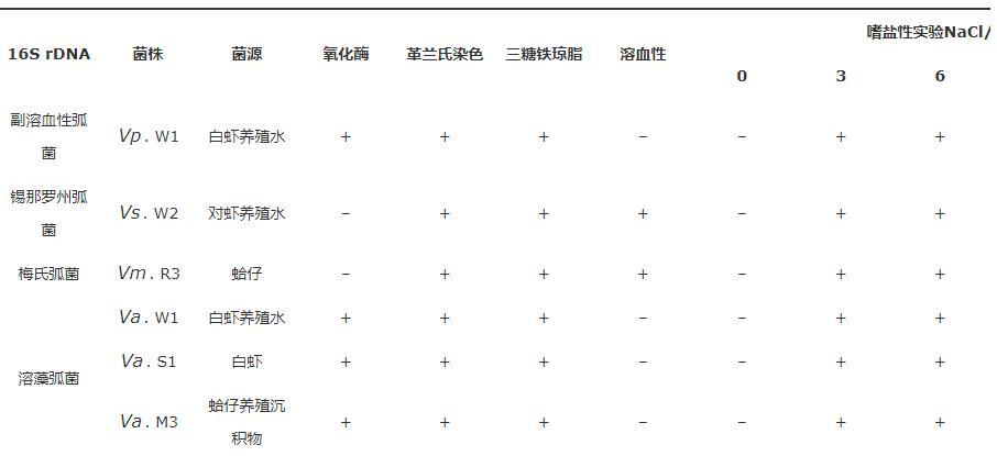 +表示为阳性反应,–表示为阴性反应,Vp.W1:来源于白虾养殖水的副溶血性弧菌,Vs.W2:来源于对虾养殖水的锡那罗州弧菌,Vm.R3:来源于蛤仔的梅氏弧菌,Va.W1:来源于白虾养殖水的溶藻弧菌,Va.S1:来源于白虾的溶藻弧菌,Va.M3:来源于蛤仔养殖沉积物的溶藻弧菌