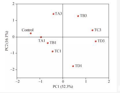 注:PC1:第一主成分;PC2:第二主成分;A:1.25 g/L;B:2.5 g/L;C:5 g/L;D:10 g/L;T:实验组;Control:对照组;1:第1 d;3:第3 d