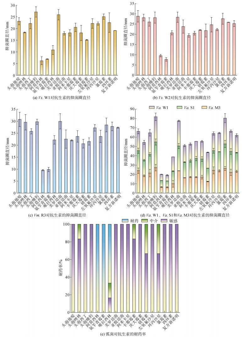 图1弧菌对抗生素的抑菌圈直径(a-d)及耐药率(e)