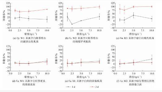 由上述生长曲线可知,各弧菌生长进入稳定期至少需要8 h,且对照组在16~24 h处于增长状态,因此在12 h计算各弧菌抑制率如图3。裂片石莼水培液对各弧菌具有不同的抑制作用,Vp.W1、Vs.W2和Vm.R3在1.25~10 g/L的裂片石莼水培液培养1 d时的抑制率范围为1.32%~39.42%,但在培养3 d时抑制率处于64%~100%,且10 g/L处理组抑制率达80%以上,显著高于第1 d(10.37%~30.06%)(P<0.05)。其中,培养1 d时低密度(2.5 g/L)的水培液对Vs.W2没有抑制作用,对溶藻弧菌抑制率均不超过35%,且培养1 d和3 d的抑制效果差异不显著。