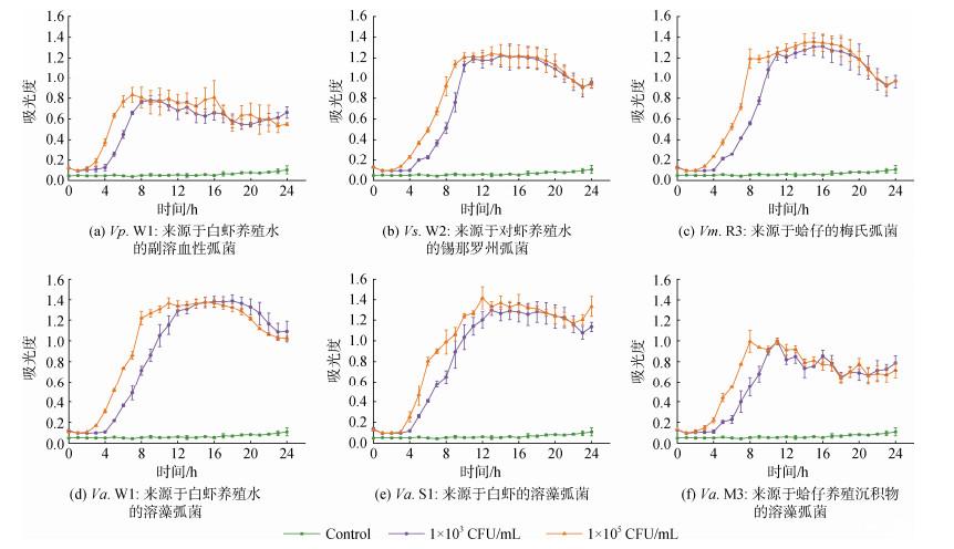 注:Vp.W1:来源于白虾养殖水的副溶血性弧菌,Vs.W2:来源于对虾养殖水的锡那罗州弧菌,Vm.R3:来源于蛤仔的梅氏弧菌,Va.W1:来源于白虾养殖水的溶藻弧菌,Va.S1:来源于白虾的溶藻弧菌,Va.M3:来源于蛤仔养殖沉积物的溶藻弧菌
