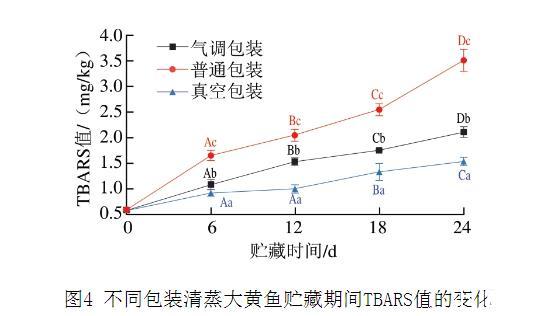 2.4包装方式对清蒸大黄鱼贮藏过程中TBARS值的影响