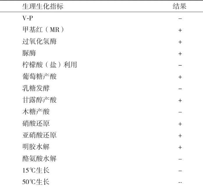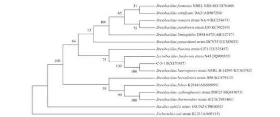 通过表2所得的16项生理生化试验结果,结合形态学特征,依据《伯杰氏细菌系统鉴定手册》,判断该菌株可能是侧孢短芽孢杆菌(Brevibacillus laterosporus)。