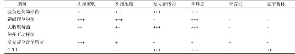表3五种指示菌与侧孢短芽孢杆菌C-5-1的药敏分析
