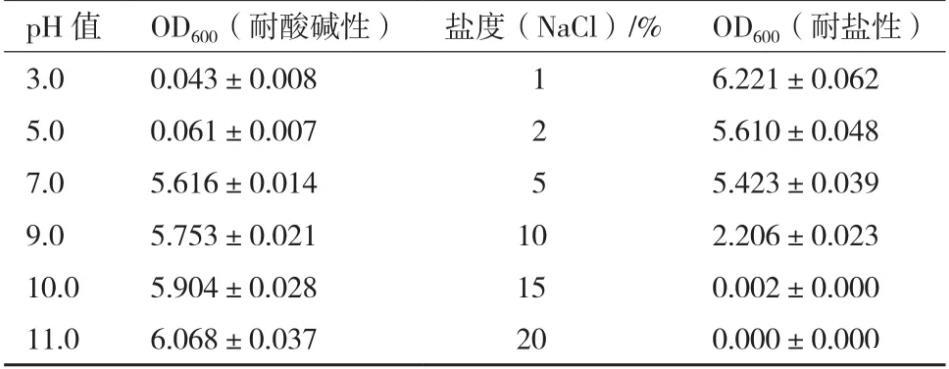 分别测定细菌在不同酸碱度和盐度的生长特性,从而为该菌株的进一步培养和发酵利用提供依据。结果(表4)显示,侧孢短芽孢杆菌C-5-1在低pH环境中耐受性有限,在pH≤5.0时几乎没有生长,但在pH≥7.0时生长良好,并且随着pH值的升高,菌体量也一直在增加,这说明该菌株耐碱不耐酸。菌株C-5-1在NaCl盐度≤5%(相当于50 g/L)时正常生长,但随着盐度的增加该菌株的生长受到了一定的抑制,当盐度≥15%时,其生长受到了完全抑制甚至死亡。这是因为不同盐度能形成不同渗透压环境,造成细胞不同程度的脱水,从而降低生长速率,甚至失活。
