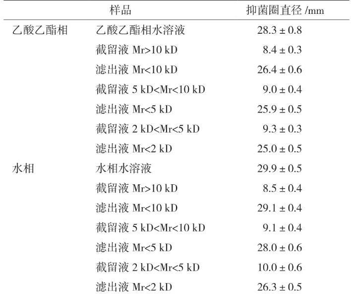 由表5可知,侧孢短芽孢杆菌C-5-1发酵液的乙酸乙酯相和水相都有明显的抑菌圈,直径分别为(28.3±0.8)mm和(29.9±0.5)mm,指示菌为铜绿假单胞菌,这说明该菌株不止产生一种抗菌物质。后又通过超滤离心管对二者进行了纯化,研究表明这两种抗菌代谢产物的分子量均小于2 000。
