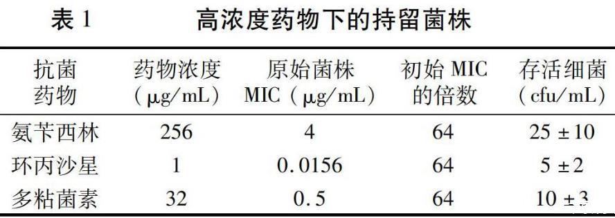 在高药物浓度的培养条件(氨苄西林256μg/mL,环丙沙星1μg/mL,多粘菌素32μg/mL)下,持续作用6 d,依然能够检测到存活的细菌。按照接种量104 cfu/mL数量级计算,存活率在0.1%左右(表1)。此试验结果表明,即使在有限的空间内,只要初始接种量达到一定数量,高于致死浓度的抗菌药物并不能完全杀死细菌,总会有一小部分细菌存活下来。