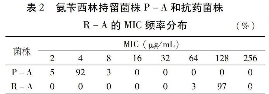 在药物氨苄西林浓度为256μg/mL条件下,先后共收集存活的细菌134株,测定其MIC,90%以上的菌株与原始菌株持平,少数略高于原始菌株一个或两个梯度,均远远低于其生存环境的药物浓度。环丙沙星和多粘菌素作用下的群体也存在同样的现象(数据略)。这些在高浓度药物作用下存活的细菌,其MIC却保持不变,为持留菌。致死量的抗菌药物不能将其杀灭,说明持留菌通过某种机制耐过了高浓度的药物,并且保持了原有的药物敏感特性。随机选取其中一株氨苄西林的持留菌,在氨苄西林浓度为256μg/mL的环境中得以存活,测定其分裂繁殖的后代实际MIC为4μg/mL,经传代后MIC保持不变,命名为菌株P-A,是原始菌株持留菌株繁殖后代的纯培养。