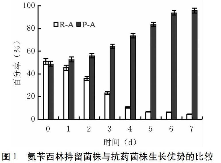 氨苄西林处理的P-A和R-A菌株MIC范围无相互交叉,将二者等比例混合接种培养,根据稳定的MIC范围统计其比例变化。如图1所示,混合培养后,持留菌株P-A所占比例逐渐升高,到第4 d增至70%以上,至第7 d抗药菌株R-A比例低于5%,菌株P-A数量占绝对优势。此结果表明,在没有药物的培养条件下,P-A具有更强的生长优势。随机挑选氨苄西林作用下存活的其它持留菌株和抗药菌株,用同样的方法对比其生长优势,也有类似的结果(数据略)。另外两种药物环丙沙星和多粘菌素的持留菌株和抗药菌株,生长优势的比较也存在类似结果(数据略),最终都能体现出持留菌株具有更强的生长优势。本研究中共检测8组菌株的对比,未检测到例外情况。
