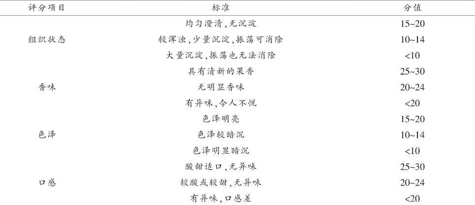 对果汁感官鉴定的方法,制订表1中鲜榨橙汁的评分标准,选择10名食品专业的学生分别从气味、色泽、口感、状态4个方面对橙汁进行感官评价,总分为100分。