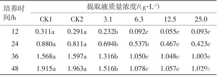 由表1可以看出,CK1和CK2处理组D(λ)600相近,都显著高于苦瓜叶片乙醇提取液中的D(λ)600.随着提取液浓度的增大,农杆菌培养液的D(λ)600呈下降趋势,但在6.3、12.5和25.0g/L 3个处理浓度下,培养液D(λ)600的差异没有统计学意义。