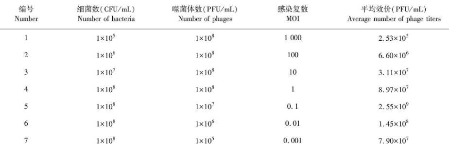 噬菌体SJTJYCA01和宿主菌XJJYCA01的MOI为0.1时的效价最高(效价值达2.55×109),说明噬菌体SJTJYCA01和宿主菌XJJYCA01的最适感染复数为0.1。见表1。