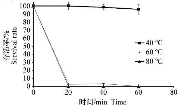 在40℃条件下,噬菌体SJTJYCA01的存活率不随时间的增加而减少;在60℃条件下,噬菌体SJTJYCA01的存活率大幅下降,作用20 min后存活率仅为原噬菌体的3%;在80℃条件下,各个时间段均未见有噬菌体存活。见图3。