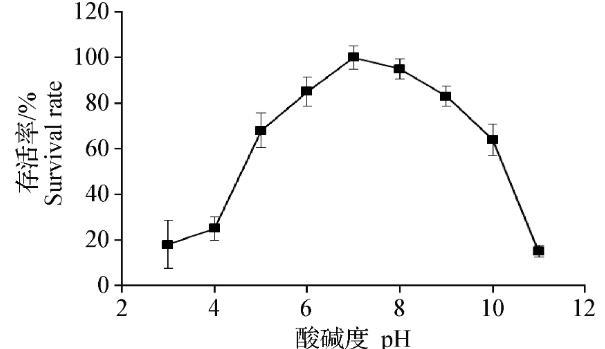 噬菌体SJTJYCA01对强酸强碱均较为敏感,在pH 5~10时较为稳定;噬菌体SJTJYCA01的最适pH 7。见图4。