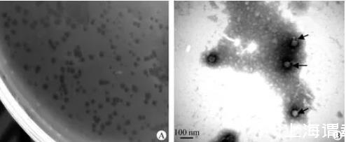 图1噬菌体的噬菌斑(A)和超微形态图(B)