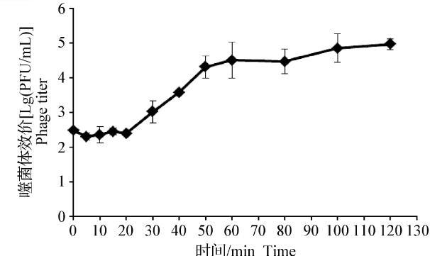 一步生长曲线的结果见图2,噬菌体SJTJYCA01的潜伏期为20 min,裂解期达40 min,裂解量为裂解期平均噬菌体数(14 458 PFU/mL)/潜伏期平均噬菌体数(255 PFU/mL)=57。