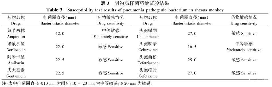 本研究中,从死亡恒河猴肺中分离到阴沟肠杆菌,该株阴沟肠杆菌对小鼠具有较强的致病性。药敏试验结果表明阴沟肠杆菌对头孢哌酮、头孢噻肟最敏感,这为今后发现相同疾病的临床治疗工作提供一定的理论依据。