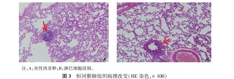 图3恒河猴肺组织病理改变(HE染色,×100)