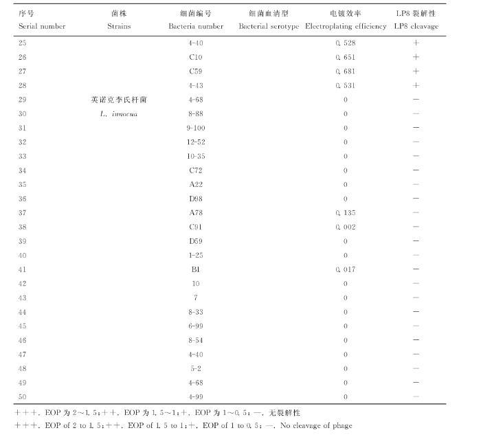 利用实验室所保存的产单核细胞李氏杆菌、威尔斯李氏杆菌和英诺克李氏杆菌对LP8噬菌体进行宿主谱鉴定,结果显示LP8噬菌体对18株LM都具有裂解性,对5株威尔斯李氏杆菌(C10、9-2、4-40、C59、4-43)具有裂解性,对22株英诺克李氏杆菌均无裂解性(表1)。