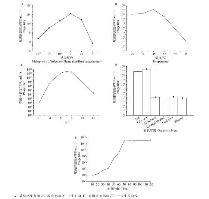 对LP8设置不同的感染比例,测定出LP8的MOI为1(图3A);设置25、35、45、55、65、75℃温度梯度,确定LP8的最适温度为45℃(图3B);设置pH为2、4、6、7、8、10、12梯度,确定LP8的最适pH为7(图3C);采用的6种有机溶剂中,氯仿和异戊醇对LP8影响最大,可造成LP8全部失活,丙三醇和SM空白对照组没有影响,甲醇和乙醇会导致噬菌体部分失活(图3D);绘制一步生长曲线,确定LP8潜伏期为23 min,对数期为23~80 min,80 min以后达到平台期,噬菌体效价最大可达到3.4×10PFU·mL(图3E)。