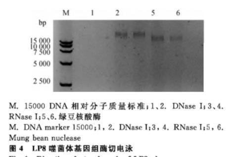 电泳条带显示,噬菌体LP8基因组在1、2号DNA酶泳道未出现条带,在3、4号RNA泳道和5、6号绿豆核酸酶泳道都出现了条带,根据条带结果得出噬菌体基因组为双链DNA(图4)。