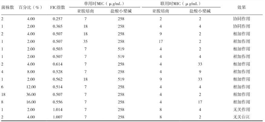 同时使用两种药物时,盐酸小檗碱、亚胺培南对CPA的MIC均有明显减少,分别为2~33、2~17μg/mL,均值分别下降为8.11、4.48μg/mL。同时使用两种药物时,表现为对5.02%的50株CPA呈无拮抗作用,88.42%的CPA呈相加抗菌作用,对6.56%CPA呈协同抗菌作用。两种药物联用对CPA表现出效果见表2。