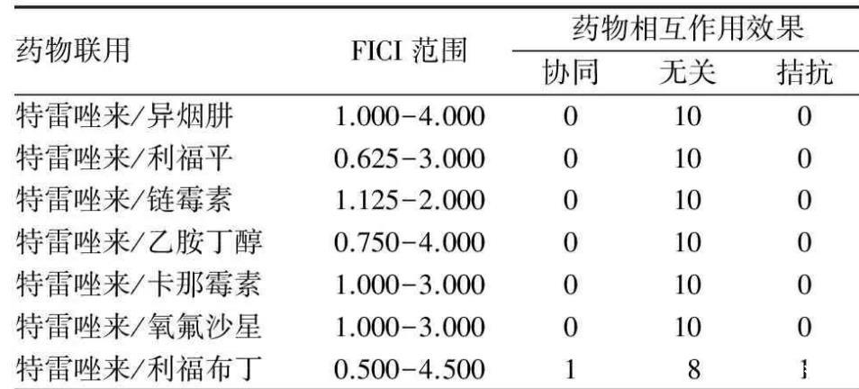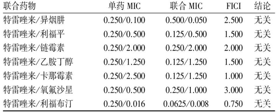 表3特雷唑来与其他抗结核药物联用对10株结核分枝杆菌临床分离株的作用