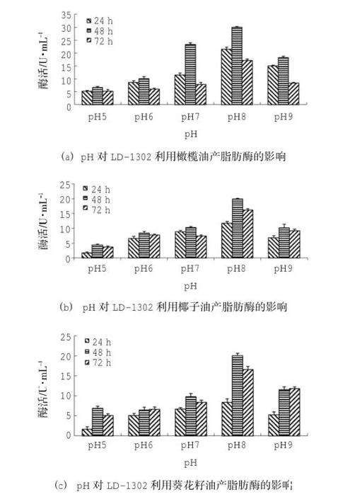 接种量为3.75×105CFU/mL、橄榄油、椰子油、葵花籽油为有机碳源时,菌株LD-1302在pH 8下有最大脂肪酶活,分别为(29.97±0.33)U/mL、(19.98±0.23)U/mL、(19.98±0.67)U/mL。(图6(a)、图6(b)、图6(c))。