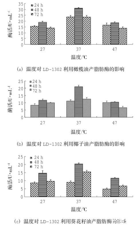 接种量为3.75×105CFU/mL、pH为8、以橄榄油、椰子油、葵花籽油为碳源时,菌株LD-1302在37℃条件下摇瓶发酵48h后产脂肪酶活最高,依次为(30.97±0.58)U/mL、(20.98±1.2)U/mL、(20.31±0.58)U/mL;产脂肪酶活性跟温度的关系均为37℃>27℃>47℃(图7)。