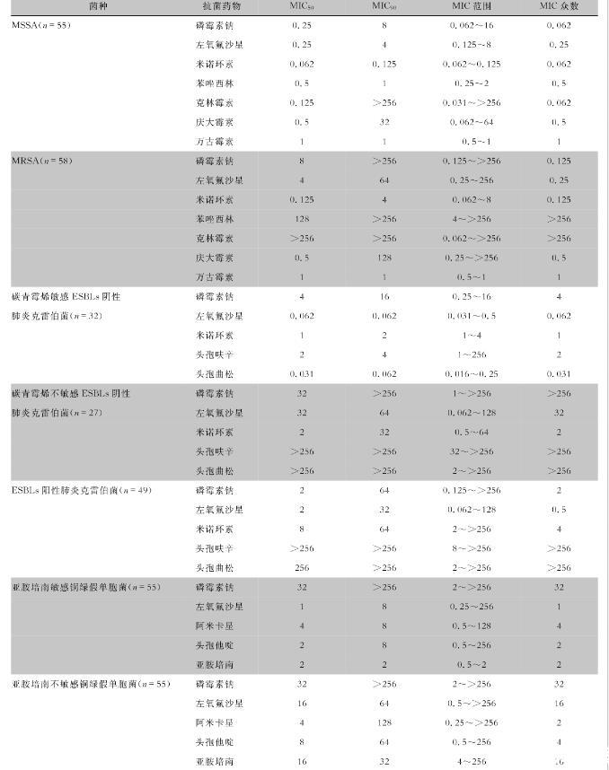 除万古霉素,磷霉素钠及其他对照药对耐甲氧西林金黄色葡萄球菌(methicillin-resistantStaphylococcusaureus,MRSA)的抗菌作用均较甲氧西林敏感金黄色葡萄球菌(methicillin-susceptibleStaphylococcusaureus,MSSA)有所下降。对于碳青霉烯类抗生素敏感且不产超广谱β-内酰胺酶(extended-spectrumβ-lactamases,ESBLs)肺炎克雷伯菌,磷霉素和对照药均显示出很好的体外抗菌活性。对于碳青霉烯类抗生素不敏感和ESBLs阳性菌株,头孢呋辛和头孢曲松均高度耐药,但磷霉素仍表现出一定抗菌活性,MIC50≤32 mg/L。对于铜绿假单胞菌,磷霉素对亚胺培南敏感或不敏感菌株的抗菌作用基本一致,但对照药均受亚胺培南敏感性下降影响,对亚胺培南不敏感菌的抗菌活性低于敏感菌株。见表1。
