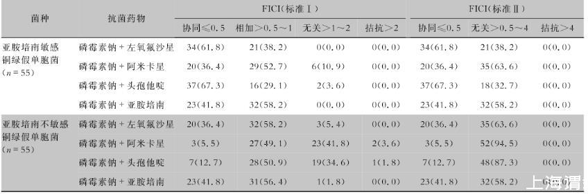 对于联合药敏结果的判定,以往常用标准Ⅰ,即协同、相加、无关和拮抗4段法。但考虑到MIC测定为二倍稀释法,同一株细菌的MIC值不同次测定时可能出现±1个稀释度的变化,因而,近年来国外较推崇标准Ⅱ,即协同、无关和拮抗3段法。本研究中将两种判定结果均展示以供比较。已有的联合药敏报道显示,研究者通常关注的是协同率与拮抗率,而两种判定中协同标准是一致的,因此不同标准对最终定性影响不大。