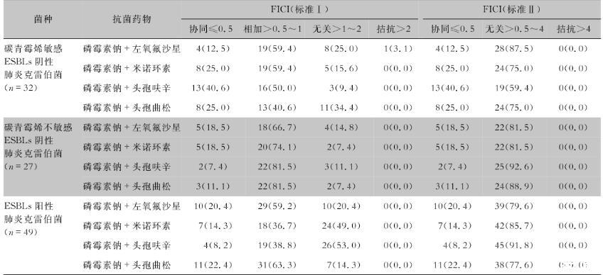 表3磷霉素钠体外联合其他药物对肺炎克雷伯菌和铜绿假单胞菌的药敏结果[株数(%)]