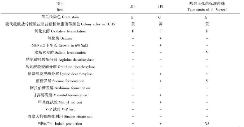 对菌株J14和J19进行形态、常规生理生化鉴定,结果显示,2个菌株均为革兰氏阴性细菌,硫代硫酸盐柠檬酸盐胆盐蔗糖琼脂培养基平板上呈黄色,生理生化鉴定结果与哈维氏弧菌特征极为相近。与标准菌株比较,部分鉴定项存在差异,推测2个菌株可能为哈维氏弧菌。对菌株J14和J19进行16S rRNA基因分子生物学鉴定,构建的系统发育树显示,2株菌与哈维氏弧菌聚为一支。综合生理生化与分子生物学鉴定结果,确定这2个菌株均为哈维氏弧菌。