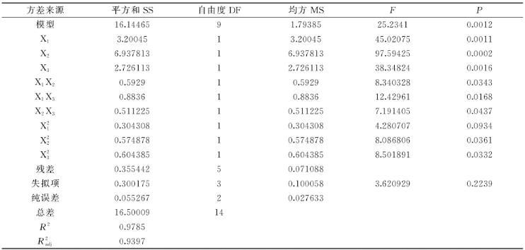 2.2.1响应面试验结果及方差分析通过Design-Expert 8.06软件设计响应面试验,基于单因素结果,以麸皮(X1)、葡萄糖(X2)及硒(X3)为自变量,以粗毛纤孔菌菌丝生长速率平均值为响应值(Y),进行响应面试验,试验方案与结果见表2。通过Design-Expert 8.06对表2结果进行分析,得到的3因素与菌丝生长速度(Y)之间的回归模型可以表述为: