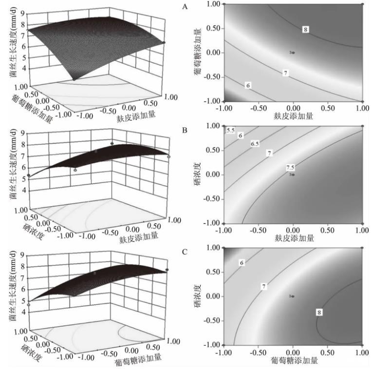2.2.2各因素交互作用对粗毛纤孔菌菌丝生长速度的响应面分析为考虑交互作用对粗毛纤孔菌菌丝生长速度的影响,在另一因素条件固定不变(编码水平为零)的情况下,分析两两因素交互作用对其菌丝生长速度的影响。通过Design-Expert 8.06软件处理上述实验设计得到3D响应曲面图和等高线分析图(图5),可以直观地看出各个因子之间的交互作用对粗毛纤孔菌菌丝生长速度的影响。响应面分析中,等高线的形状可以反映两因素间交互作应对响应值影响的强弱大小,圆形表示不显著,椭圆形则与之相反;等高线的稀疏情况反映响应面图像的平陡情况。从图5可以看出,两两因素之间的等高线形状均为椭圆形,表明其交互作用显著。由图5A可知,粗毛纤孔菌菌丝生长速度(Y)随麸皮添加量(X1)和葡萄糖添加量(X2)的增加而增加;由图5B可见,粗毛纤孔菌菌丝生长速度(Y)随麸皮添加量(X1)的增加和硒添加量(X3)的减小而增加;在较小硒添加(X3)情况下,麸皮添加量(X1)