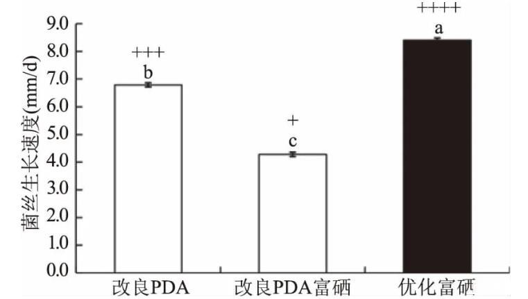 为了检测响应面结果的准确性,以改良PDA培养基为阴性对照,以等量硒添加改良PDA培养基为阳性对照,配制上述最优培养基配方进行富硒粗毛纤孔菌菌丝培养实验,每组八个重复,测得粗毛纤孔菌及富硒粗毛纤孔菌菌丝生长速度见图6。响应面优化培养基实测值8.41 mm/d>预测值8.19 mm/d>改良PDA实测值6.79 mm/d>等量硒添加改良PDA实测值 4.28 mm/d,且优化后的富硒培养基培养的粗毛纤孔菌菌丝的稠密度更高(图6)。与等量硒添加改良PDA相比,以响应面优化培养基进行培养,粗毛纤孔菌菌丝生长速度提高了0.965倍。此外,通过电感耦合等离子体质谱法(ICP-MS)对最优培养基培养菌丝的硒富集量进行检测,测得富硒粗毛纤孔菌菌丝硒富集量为31.584μg/g。说明采用响应面法获得的模型能较好地预测富硒粗毛纤孔菌菌丝的生长情况,该富硒培养基配方可以减少外源硒对粗毛纤孔菌菌丝抑制作用的影响,使其能够在富硒的同时正常甚至更好地生长,提高富硒菌丝的产量,具有一定的实用价值。