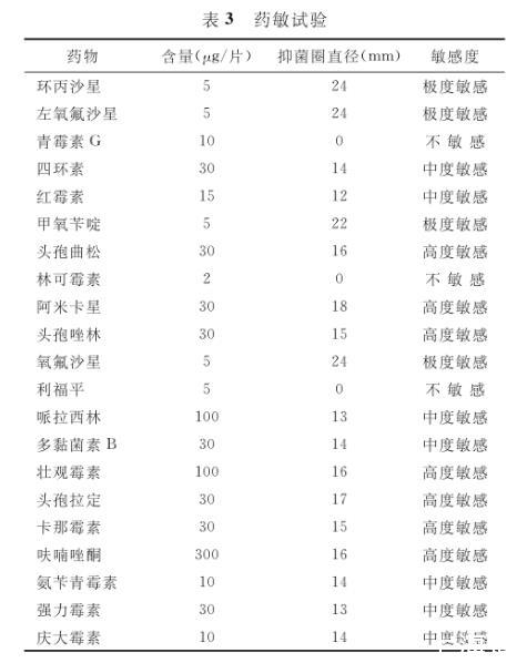 采用琼脂纸片扩增法,用高压灭菌后的棉拭子蘸取扩大培养后的菌液均匀涂布于8%兔鲜血琼脂培养基上,为了保证涂布均匀,需要重复涂布3次,待水分干后,贴上药敏纸片,轻轻按压,确保其贴稳,防止掉落和移动,注意用镊子夹取药敏纸片贴于平板上时要确保药敏纸片完全与培养基接触,以免影响药物扩散不均匀。一个平皿贴7片纸片,最中间一块,其余6块均匀分布其周围。贴好药敏纸片后放入37℃恒温箱中培养12~24h,观察测量抑菌圈的大小,抑菌圈≧20mm为极度敏感;15~20mm为高度敏感;14~10mm为中度敏感;10mm以下大于0为低度敏感;等于0为不敏感。药敏试验操作方法按2005年版CLSI/NCCLS M100-S15所述方法进行。