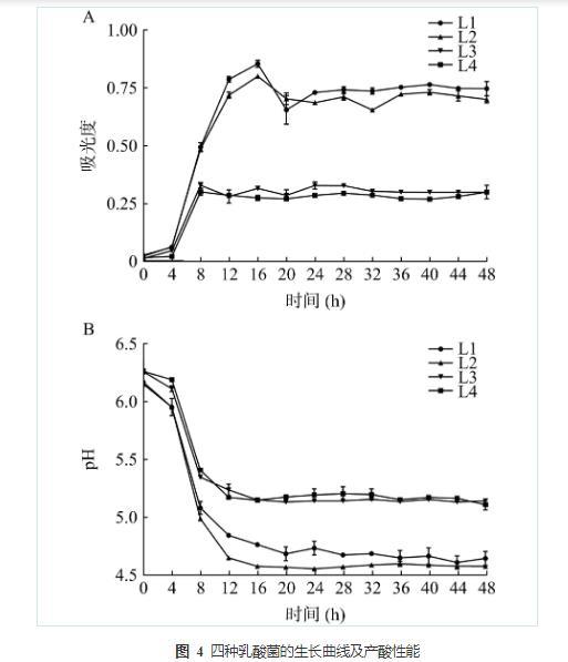 图4四种乳酸菌的生长曲线及产酸性能