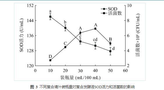 2.1.3不同复合发酵液装瓶量对SOD活力和活菌数的影响
