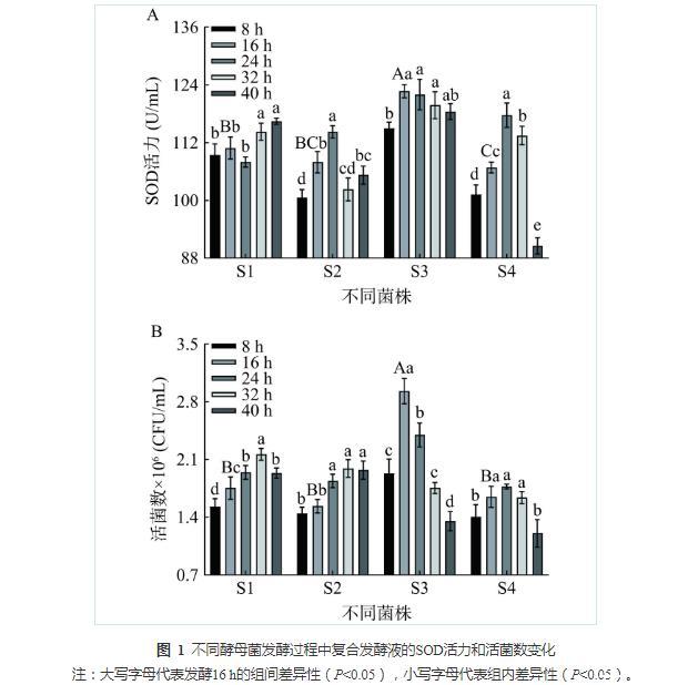 注:大写字母代表SOD的组内差异性(P<0.05),小写字母代表活菌数的组内差异性(P<0.05);图3同。
