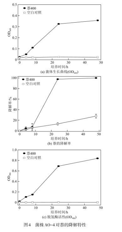 脱氢酶活性[图4(c)]在前8h升高比较缓慢,8~24h迅速升高,在24h后仍有缓慢增长的趋势。PAHs的降解是基于PAHs的氧化,降解过程中脱氢酶可以使PAHs的氢原子活化并转移至特定的受氢体,使PAHs被氧化。脱氢酶活性可在一定程度上反应微生物对有机污染物的氧化降解能力。以上结果表明菌株AO-4可有效利用400mg/L萘作为碳源生长,菌体的脱氢酶活性,菌株生长情况与萘的降解率表现出正相关。
