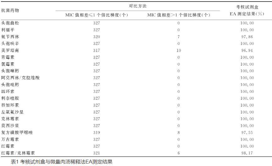 表1 考核试剂盒与微量肉汤稀释法EA测定结果