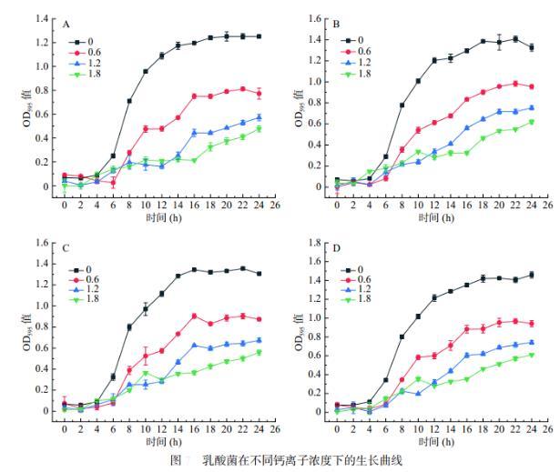 将四组乳酸菌分别接种在钙离子浓度为0、0.6、1.2、1.8 mg/mL的培养基中,对四种乳酸菌的生长曲线进行测定。从图可以看出,各菌株随着钙离子浓度的升高,乳酸菌的生长能力均有所降低。